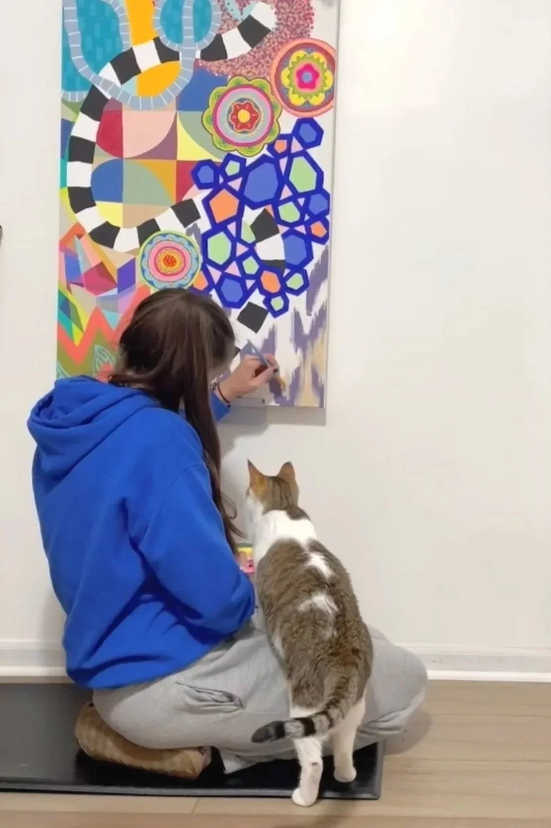 Most days you can find me in my art room in the basement of our home in the Grand Rapids, MI area. I’m typically painting while sipping on a McDonald’s Diet Coke and listening to podcasts about cults or true crime. My cats, Ingrid and Geli, are always by my side as I work. I’ve been married to my amazing husband, Jonathan, for 15 years, and I’m so grateful for him. I never planned on becoming an artist, but I love it so much and appreciate each and every person who has supported me along the way!
